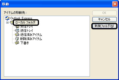 | 5. | [移動]画面が開きます。迷惑メールの振り分け先フォルダを作成します。ここでは、[ローカルフォルダ]以下に、[迷惑メール]というフォルダを作成して ください。[ローカルフォルダ]を選択して、[新規フォルダ]をクリックすると、[フォルダの作成]が開きますので、[迷惑メール]と入力し、 [OK]をクリックしてください。これで、[ローカルフォルダ]以下に、[迷惑メール]というフォルダが作成されます。 [移動]画面で[OK]をクリックしてください。 |
